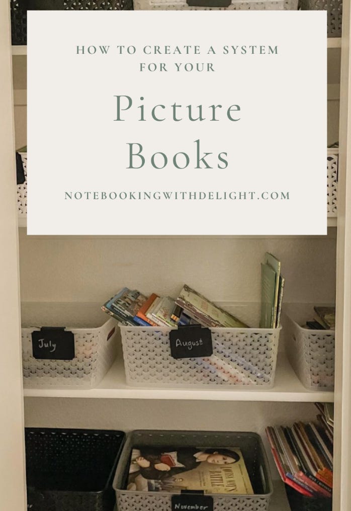 1. Organize: Organize your picture books monthly baskets. Add books from your childhood and favorite book lists.