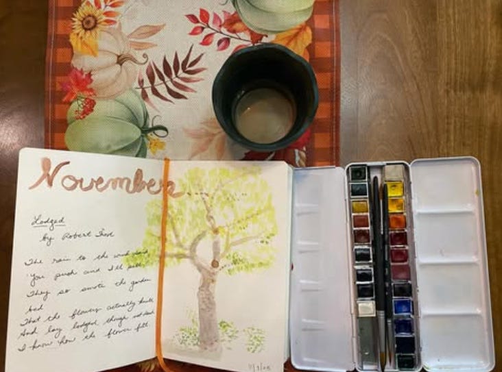 To make my nature notebook, I use a watercolor journal and watercolors. I’m inspired by the work of Edith Holden, author of The Country Diary of an Edwardian Lady.