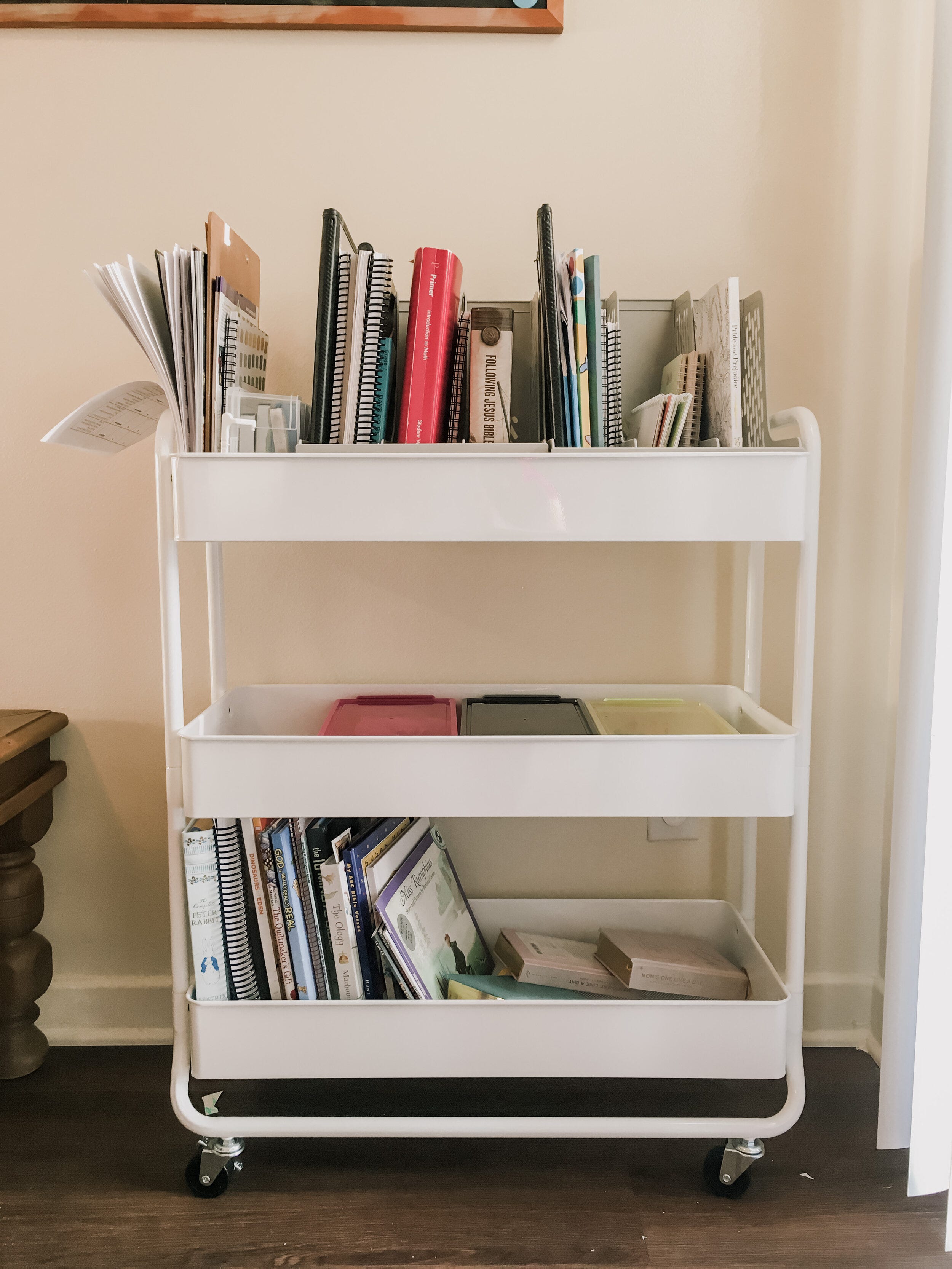 The homeschool cart is a great way to do so. I have my daughter’s books and a pencil box in the cart, and I read aloud. Although I have three children, I’m only homeschooling my oldest at the moment because the other two are too young.